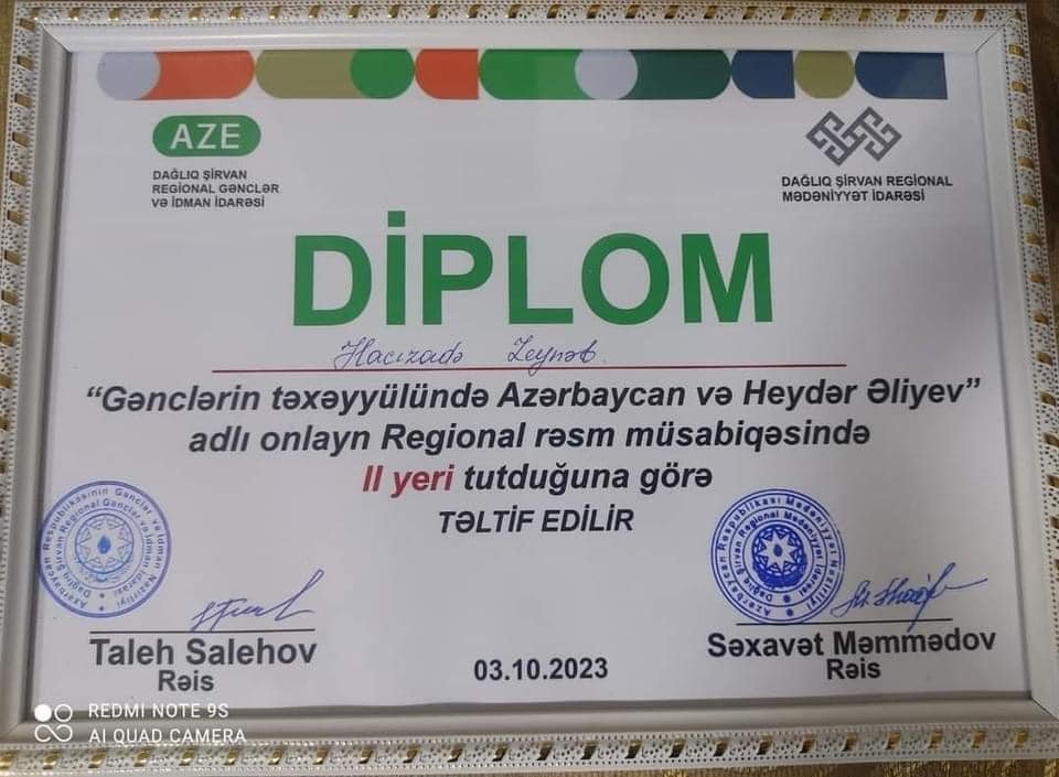 Dağlıq Şirvan Regional Gənclər və İdman İdarəsi və Dağlıq Şirvan Regional Mədəniyyət idarəsinin birgə təşkilatçılığı ilə Ümummilli Lider Heydər Əliyevin anadan olmasının 100 illiyinin qeyd olunması, istedadlı və yaradıcı gəncləri üzə çıxarılması məqsədi ilə “Gənclərin təxəyyülündə Azərbaycan və Heydər Əliyev”mövzusunda Regional rəsm müsabiqəsi keçirilmişdir.Rəsm müsabiqəsində Qobustan rayon gənci Məmmədov Baxış I yerə,Şamaxı İncəsənət Təhsili Mərkəzinizin şagirdləri Hacızadə Zeynəb II yerə,Səfərova Aysu IIl yerə layiq görülüblər.