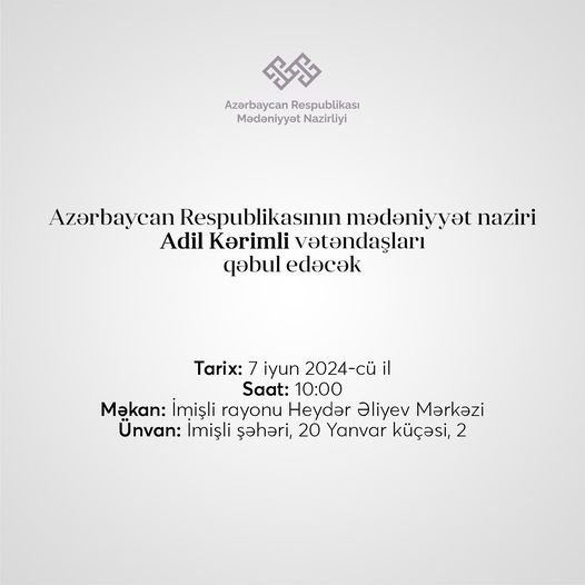 Azərbaycan Respublikasının mədəniyyət naziri Adil Kərimli tərəfindən cari ilin aprel ayında nəzərdə tutulmuş Beyləqan, İmişli, Saatlı, Sabirabad rayonlarından olan vətəndaşların qəbulu 2024-cü il 7 iyun tarixində saat 10:00-da İmişli rayonu Heydər Əliyev Mərkəzində (Ünvan: İmişli şəhəri, 20 Yanvar küçəsi 2) keçiriləcək.