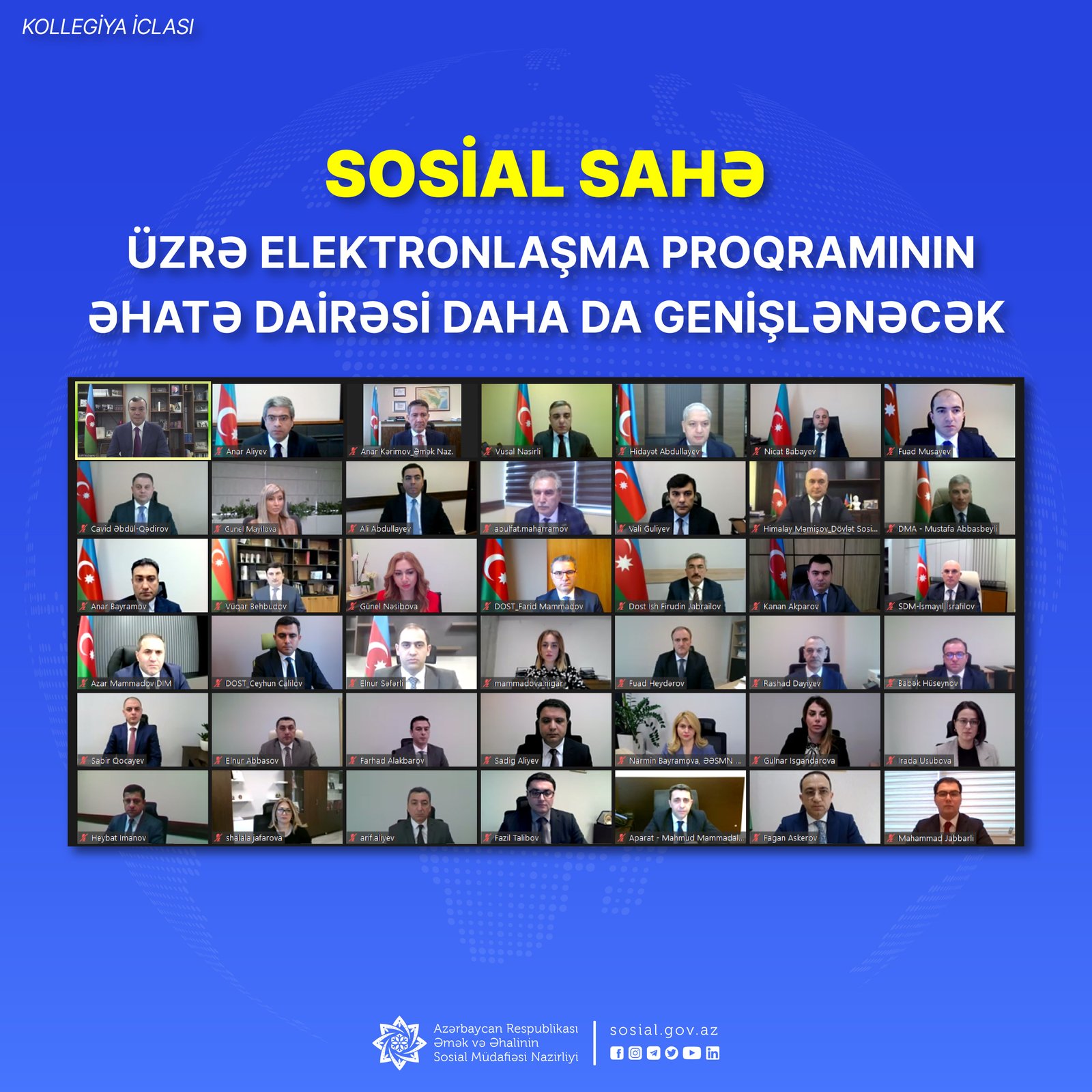 Sosial sahədə ötən beş ildə ardıcıl olaraq icra olunan elektronlaşma proqramından bəhs olunub. Keçən il də bu sahədə işlərin davam etdirildiyi, artıq Nazirliyin 153 xidmətindən 140-dan və ya 90 faizdən çoxunun elektronlaşdırıldığı, e-sistem üzərindən 51 proaktiv xidmətin fəaliyyət göstərdiyi qeyd edilib. Ötən il Nazirliyin informasiya sistemləri “Hökumət buludu”na keçidi tam təmin olunan ilk dövlət qurumu olduğu diqqətə çatdırılıb.