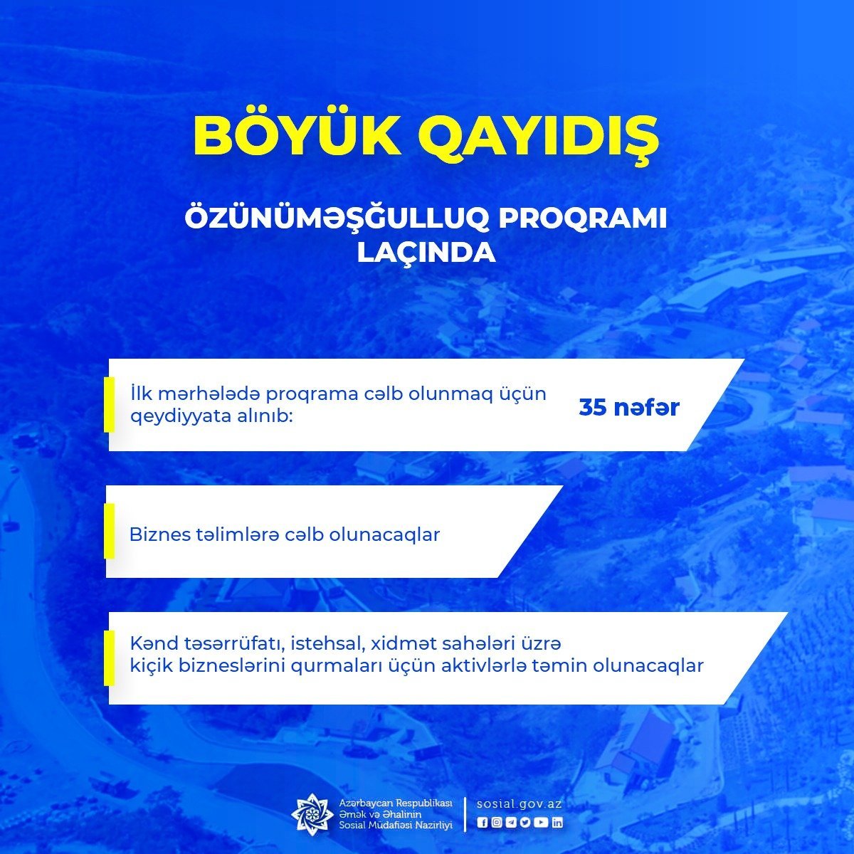 Sakinlərdən ilkin mərhələdə artıq 35 nəfər özünüməşğulluq proqramına cəlb edilmələri üçün qeydiyyata alınıb. Həmin şəxslər üçün əvvəlcə biznes təlimləri təşkil ediləcək, iştirakçılara sahibkarlıq fəaliyyəti və müvafiq dəstək mexanizmləri barədə məlumatlar veriləcək.