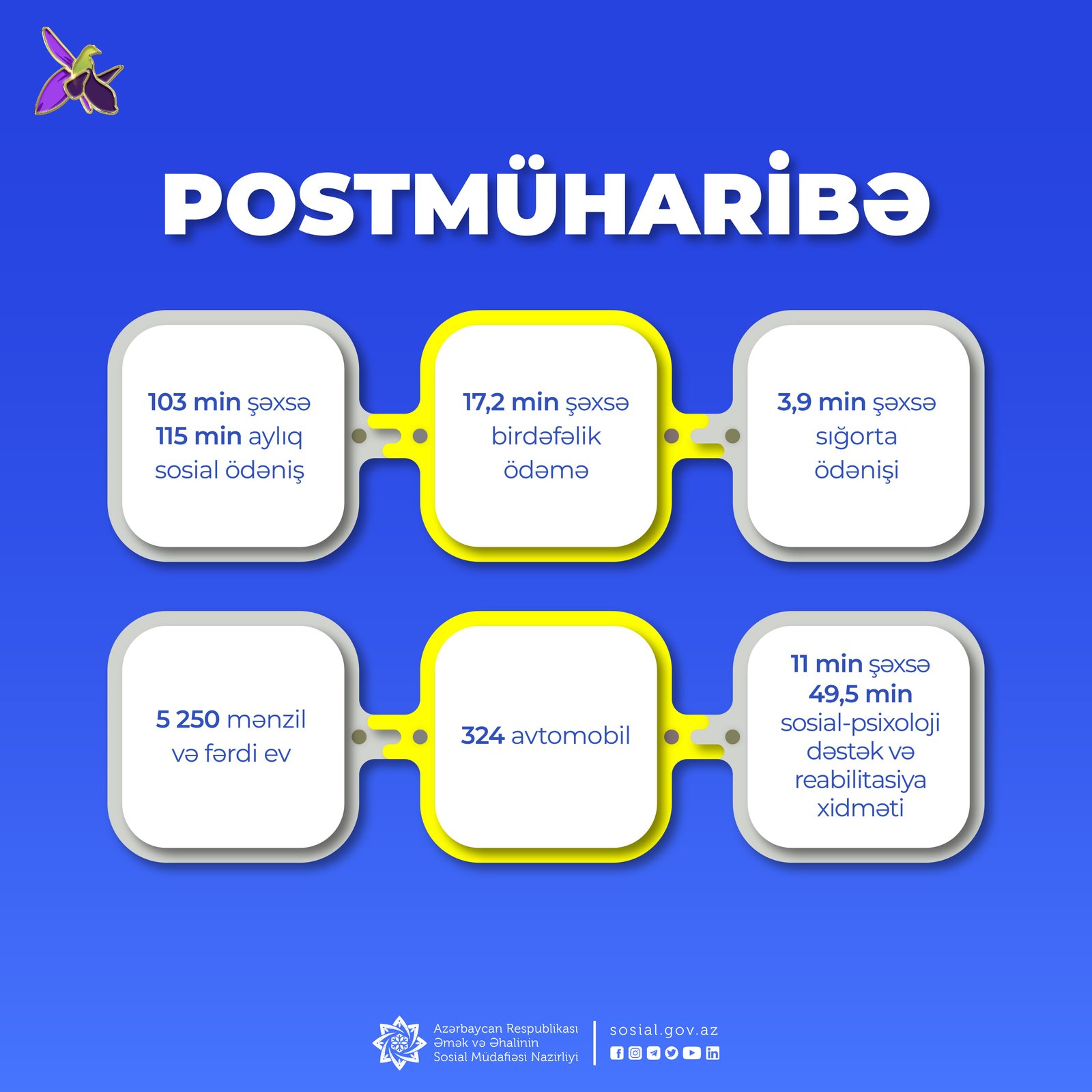Postmüharibə dövründə qeyd olunan sosial dəstək paketi 124 min şəxsi əhatə edərək, onlara dəstək yönümlü 304 min xidmət göstərilib.