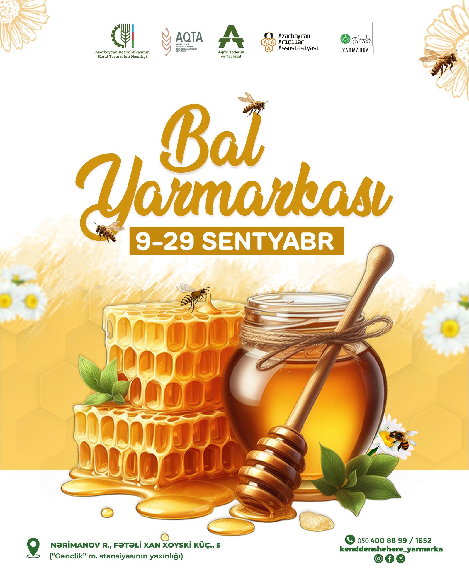 Kənd Təsərrüfatı Nazirliyinin və Azərbaycan Arıçılar Assosiasiyasının birgə təşkilatçılığı ilə arıçılıq məhsullarının 24-cü Respublika Sərgi-Satış Yarmarkası keçiriləcək. Yarmarka 09-29 sentyabr tarixlərində Nərimanov rayonu, Fətəli xan Xoyski küçəsi, 5 ünvanında (“Gənclik” metro stansiyasının yaxınlığı) təşkil ediləcək.